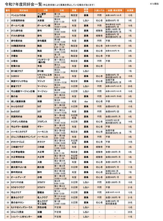 守山福祉会館では、会員が自主的に運営している同好会活動に対し、活動の場所を提供し支援しています。